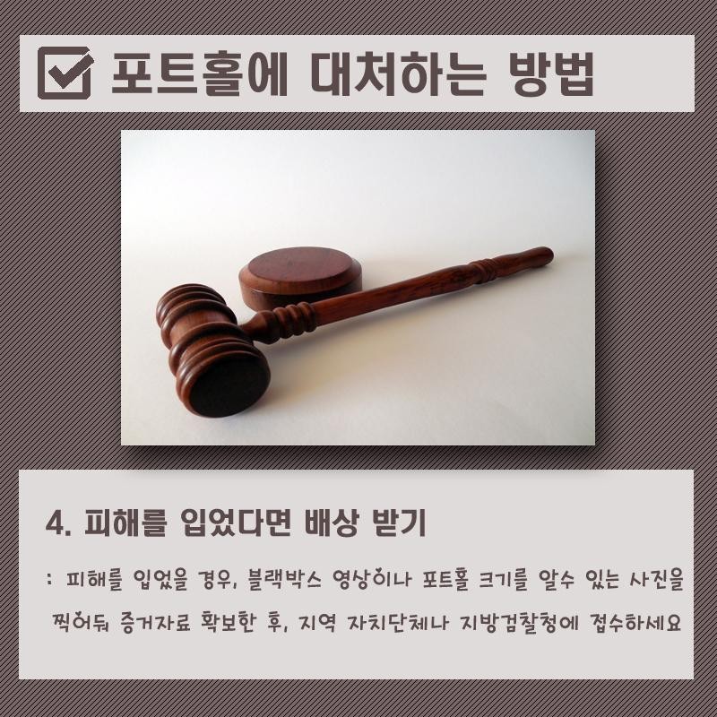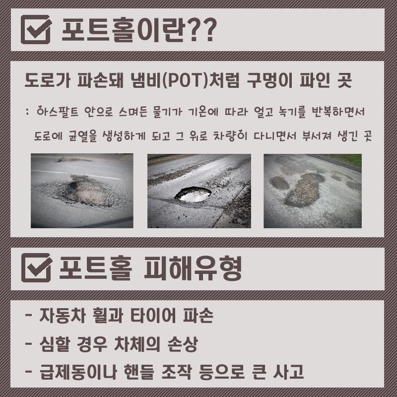 저도 작년 봄에 피트홀로 인한 타이어 및 휠 파손되어 수리비 40만원 정도를 자비로 처리하였는데~~ㅠㅠ
