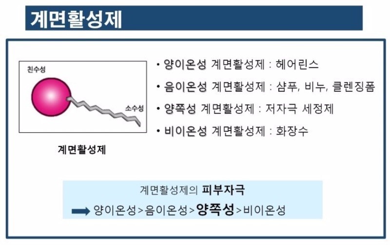 ☞양쪽성 계면활성제 - 분자 중에 양이온 활성기와 음이온 활성기를 가지고 있으며 양이온은 산성영역에서 음이온은 알카리성 영역에서 해리한다. 세정작용이 있으면서, 피부자극이 적어 저자극 샴푸, 베이비 샴푸 등 피부 자극이 적은 세정제품에 사용된다.