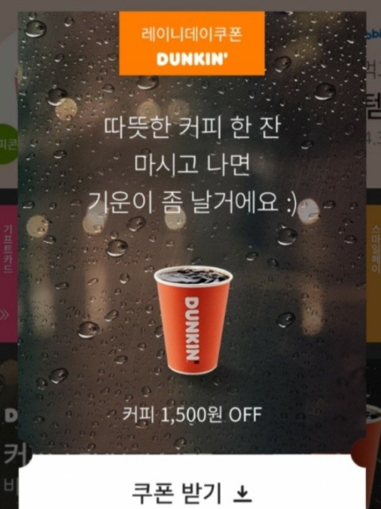레이니데이 쿠폰이 언제 부터 생긴지는 모르겠지만 제가 이용한건 1년 6개월 정도 된거 같아요~~작년에는 던킨에서 커피할인과 무료 도넛 1개를 주었는데 올해는 도넛이 빠졌네요