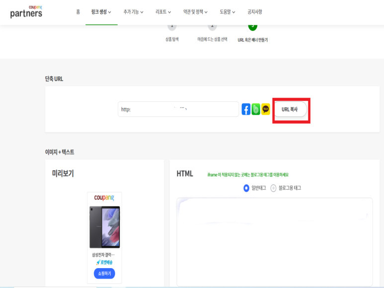 -쿠팡 파트너스 사이트 로그인 후 상품 링크를 제작(복사)하여 등록한 사이트에 업로드
