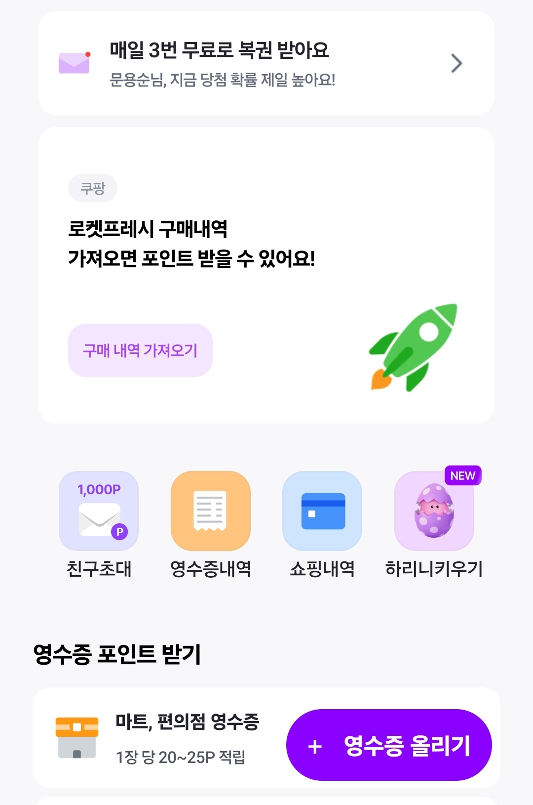 특히 편의점/마트 영수증 뿐 아니라 쿠팡 구매내역도 연동해서 소소하지만 꾸준히 혜택을 받고 있습니다.