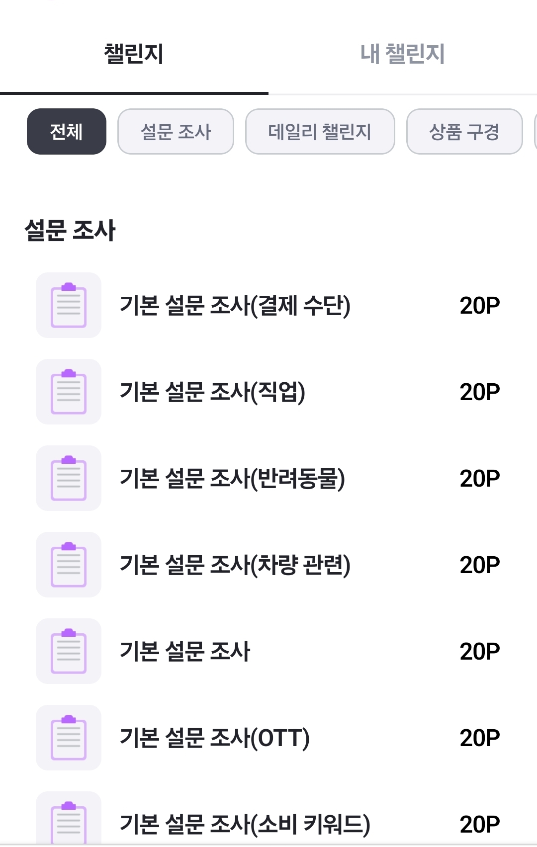▲영수증 업로드뿐 아니라 챌린지에서 설문조사로 포인트 추가 적립가능해요